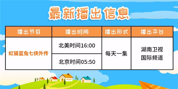 2月7日起每天一集,湖南卫视国际频道北京时间5点50分,北美时间下午4点,《虹猫蓝兔七侠外传》与海外观众朋友见面。